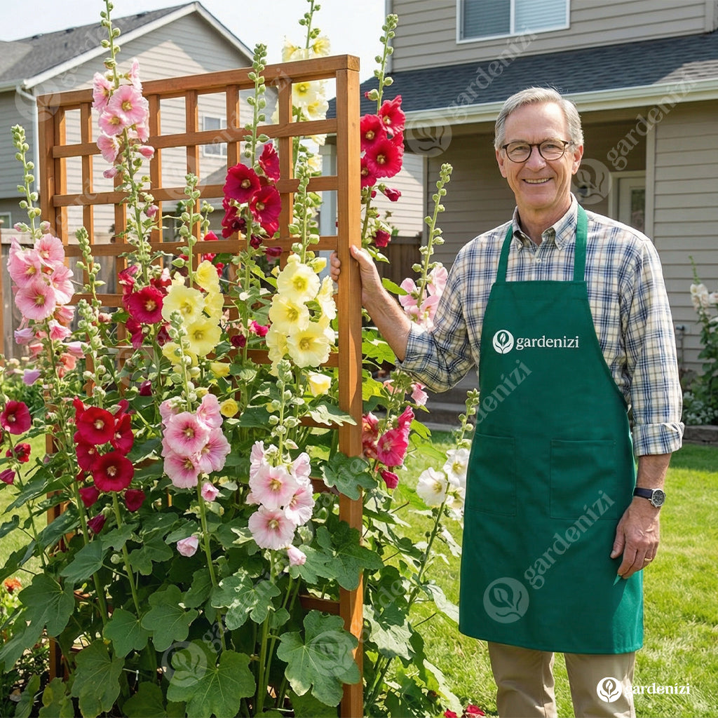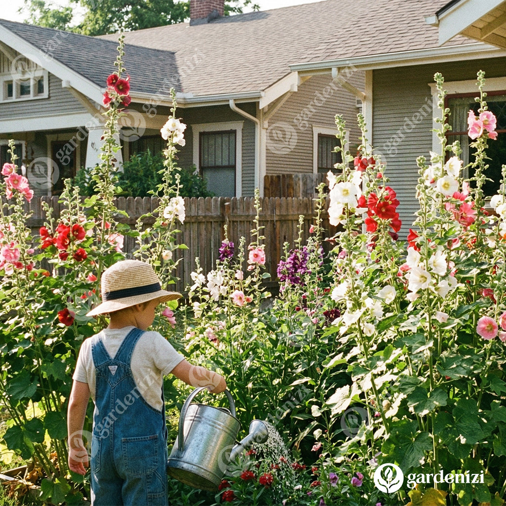 Sow Double Hollyhock seeds directly outdoors in late spring or early summer. Prepare the soil by loosening it and removing weeds. Scatter seeds on the soil surface and cover lightly with a thin layer of soil. Water gently and keep the soil moist until germination occurs (10-14 days).Once established, these tall, elegant plants require minimal care and will reward you with stunning blooms year after year.